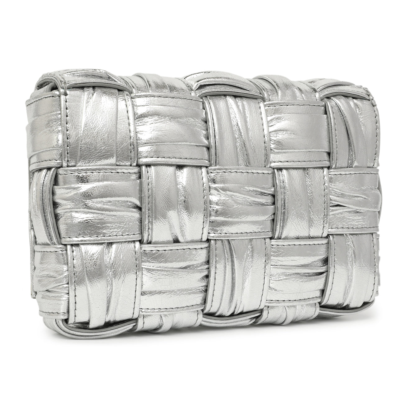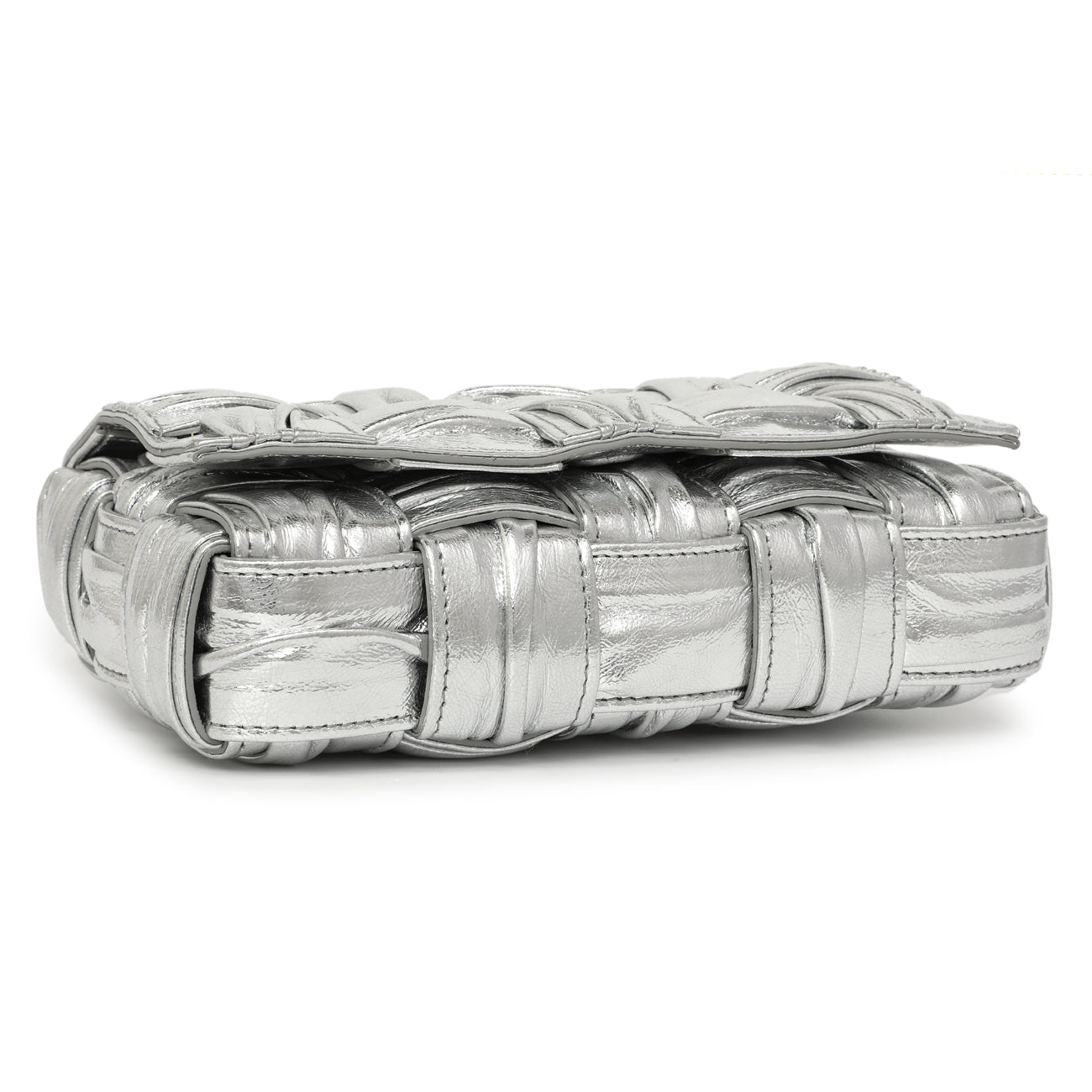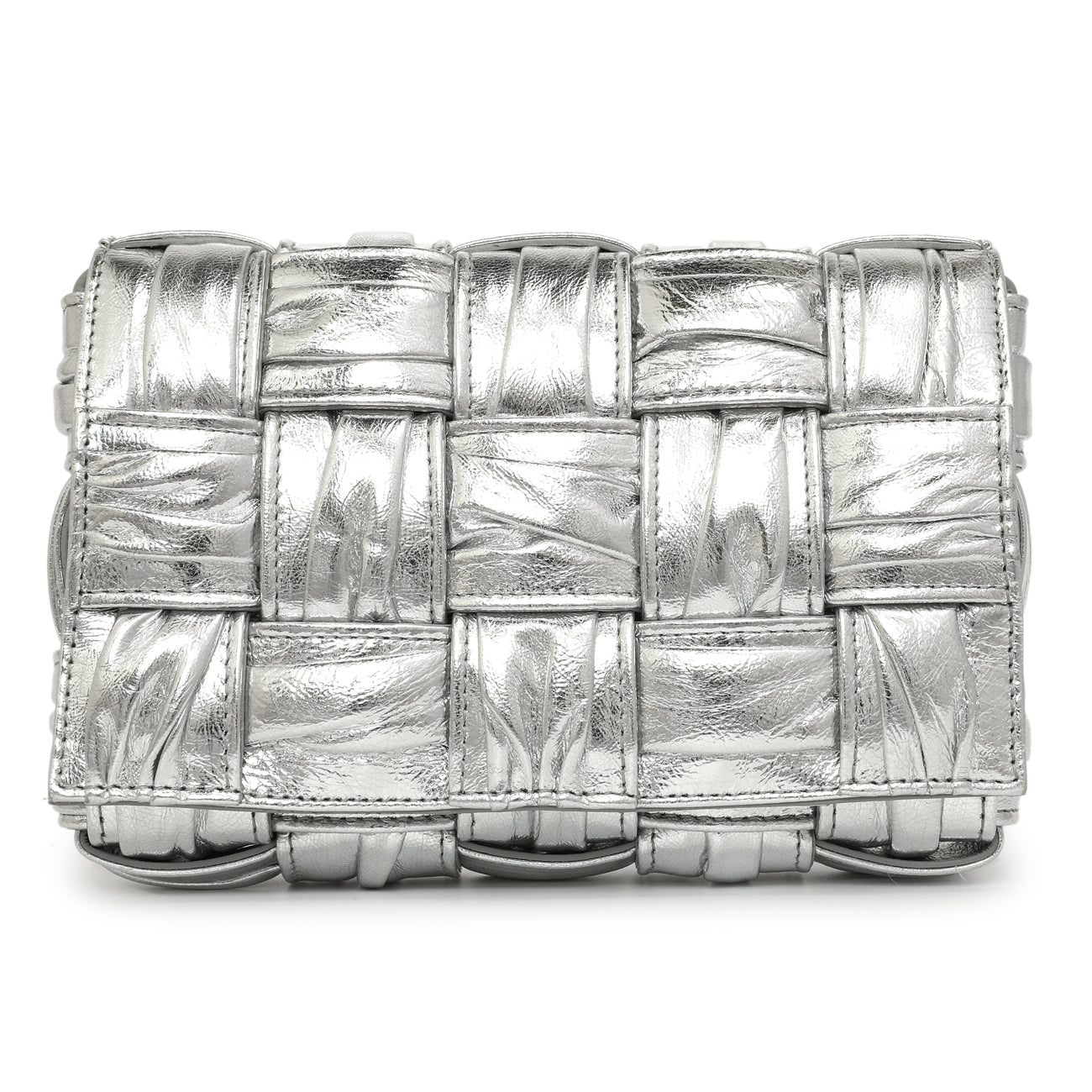 Bottega Veneta Metallic Silver Calfskin Intreccio Plisse Small Cassette Crossbody Bag
