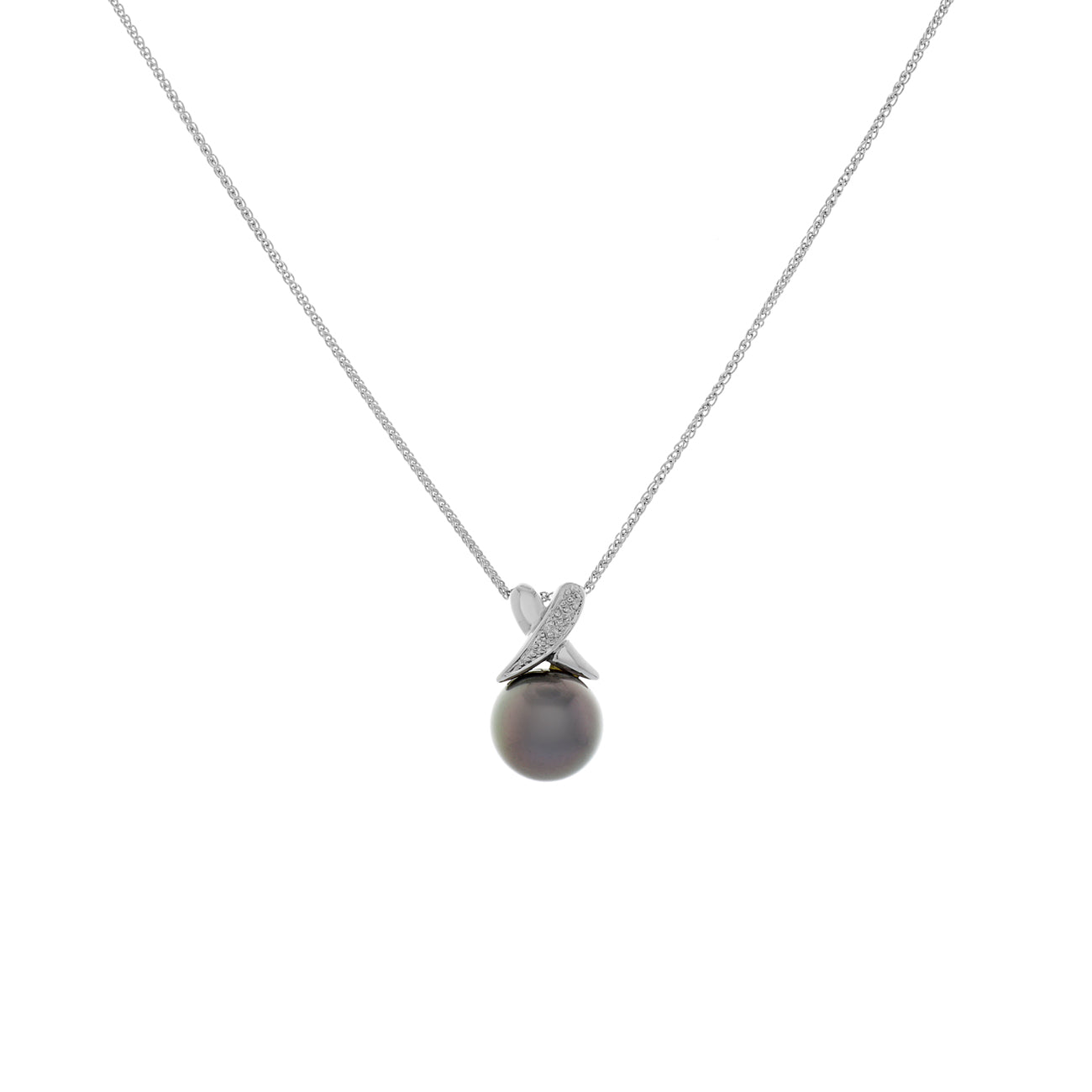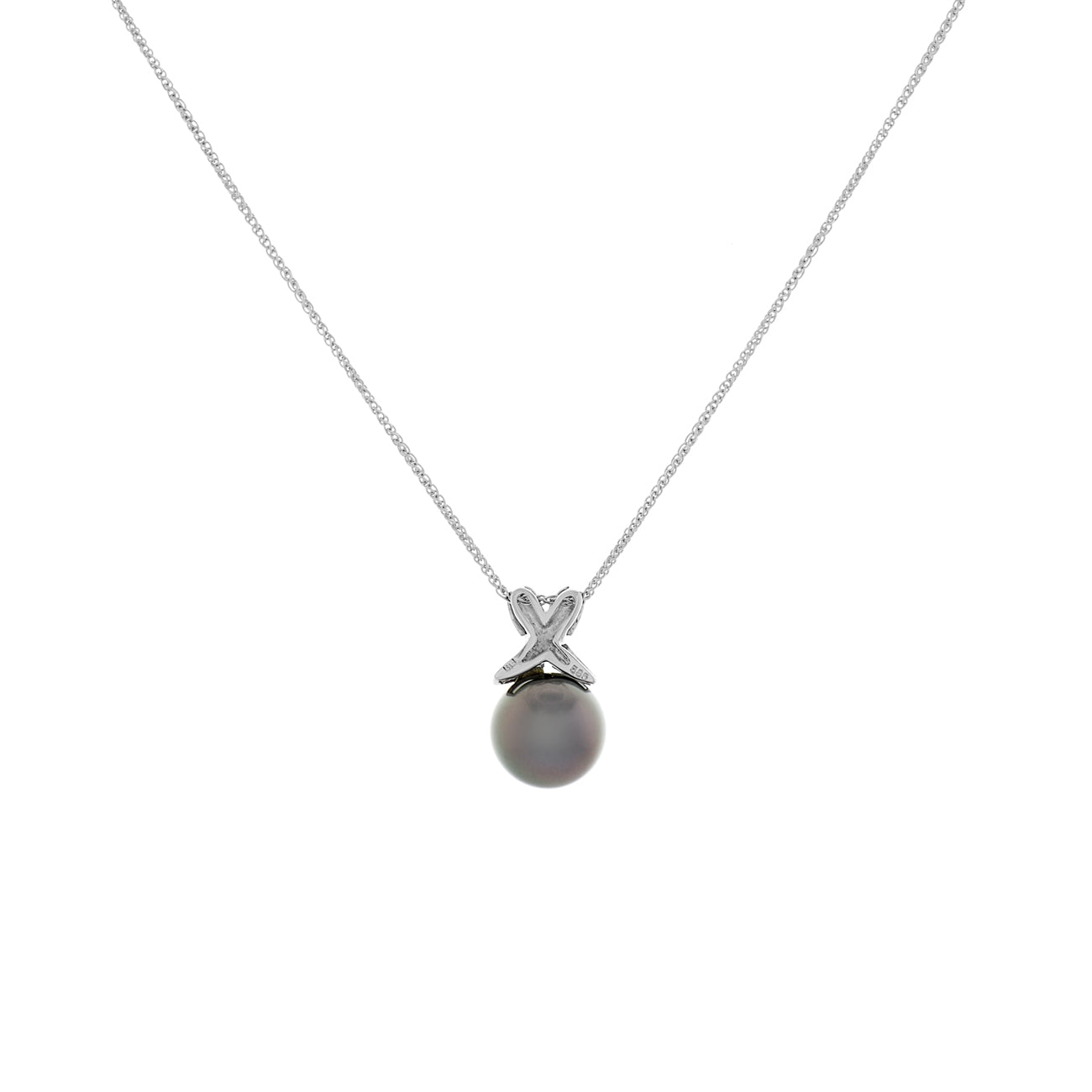 One Tahitian black pearl post set at the base of a 14 karat white gold "X" shaped slide pendant top. One arm of the "X" top has a granulated finish. The pendant suspends on a 14 karat white gold fine gauge double curb link chain 1.0mm wide measuring 16 inches in length secured by a lobster catch.