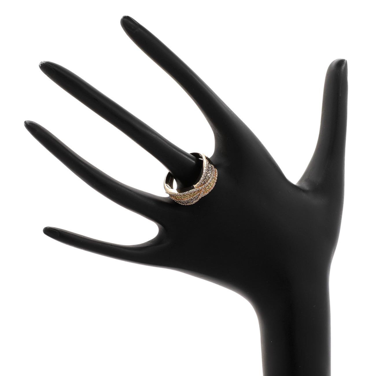 One 14 karat yellow gold ring of classic design consisting of a polished band with elevated crossover top approximately 10.0mm wide tapering to 4.0mm at the back. The ring top is bead set with a contour of fancy yellow diamonds intersected by fancy brown diamonds, the colours defined by raised edges set with colourless diamonds.
