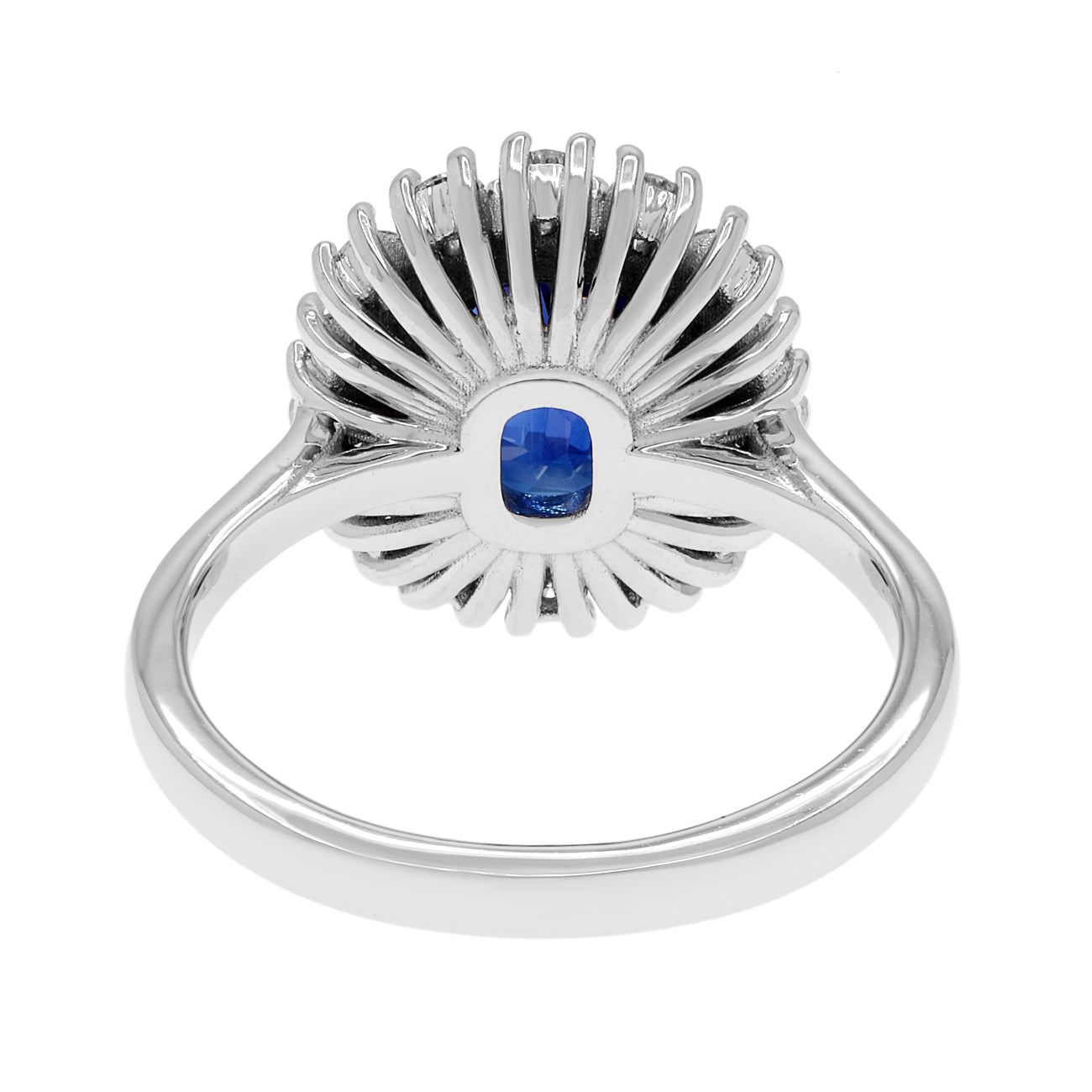 One ladies' 18 karat white gold ring of classic design consisting of a domed and polished 2.0mm wide shank which extends from the shoulders to an elevated cluster setting with structured base. The cluster is centrally claw set with a faceted oval sapphire surrounded by full cut diamonds as described below.