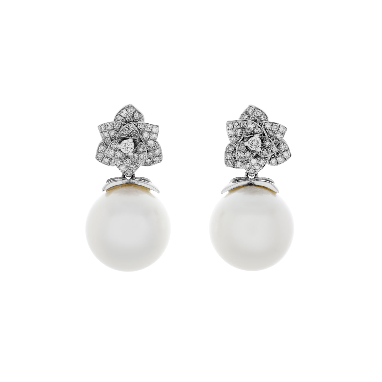 One pair of South Sea pearl earrings each secured by a trefoil style cap and suspended from the base of a multi-petaled blossom cluster top. Each earring top is centrally claw set with a round brilliant cut diamond surrounded by single cut diamonds pave set in the petals of the blossom. Each earring measures approximately 25.3mm in length secured by a french post and butterfly backing.
