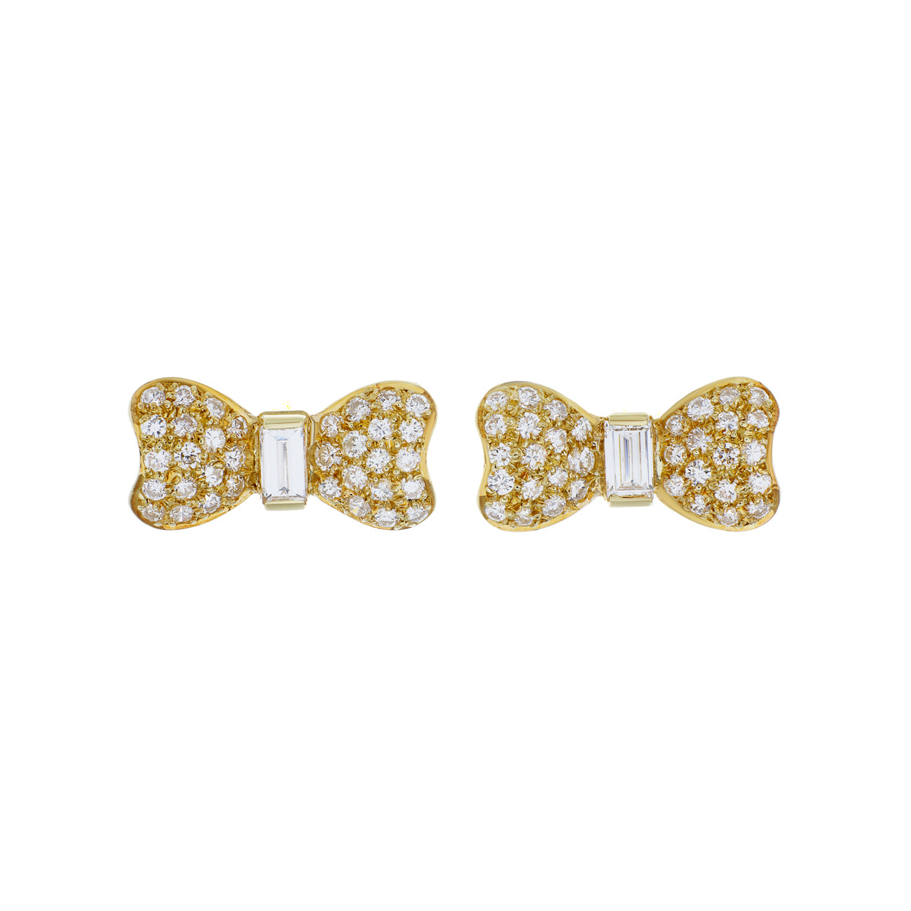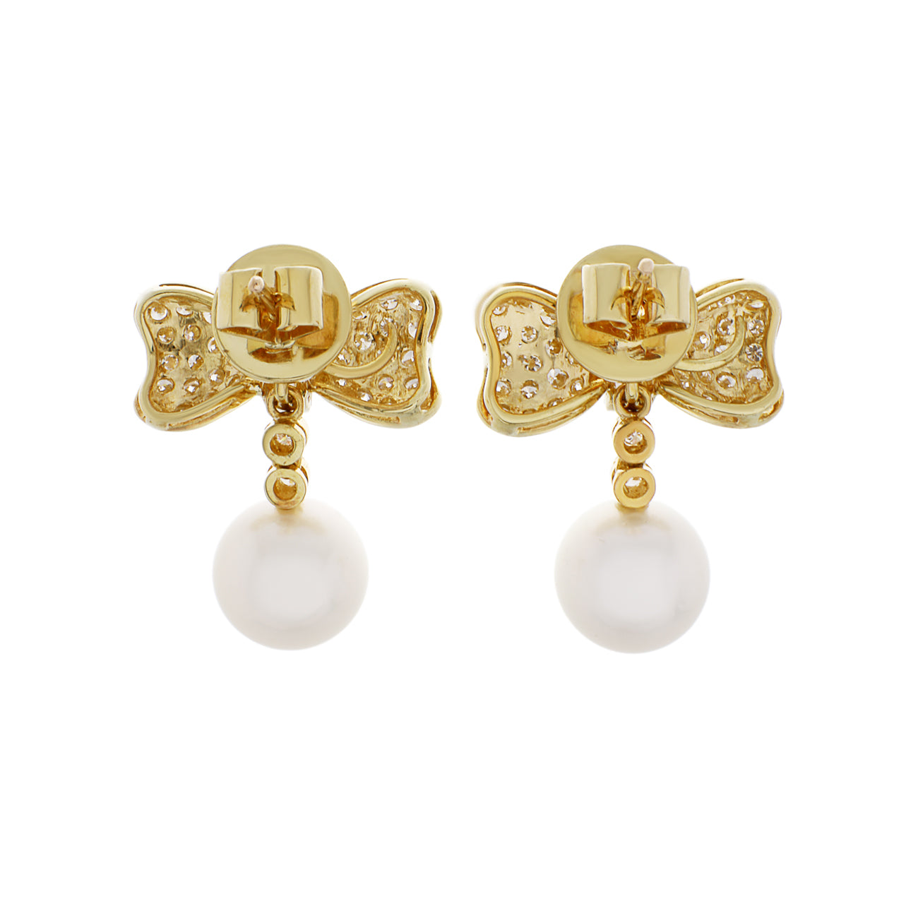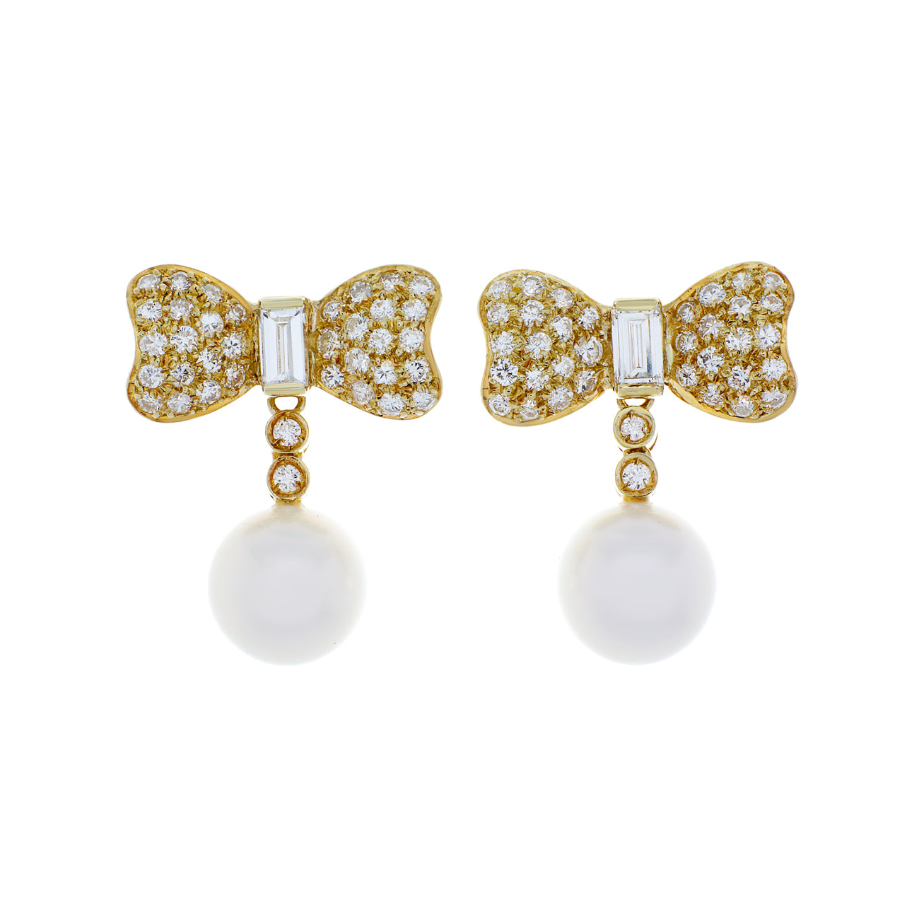 One pair of 18 karat yellow gold pierced earrings each with an ornate bow shaped top centrally channel set with a baguette cut diamond framed by pave set full cut diamonds. Suspended from the base of each earring is a cultured South Sea pearl at the base of articulated Riviere style links set with full cut diamonds. The pearls and Riviere set diamonds are detachable from the bow tops. Each earring measures 21.0mm long by 17.5mm wide secured by a French post and hand made butterfly backing.