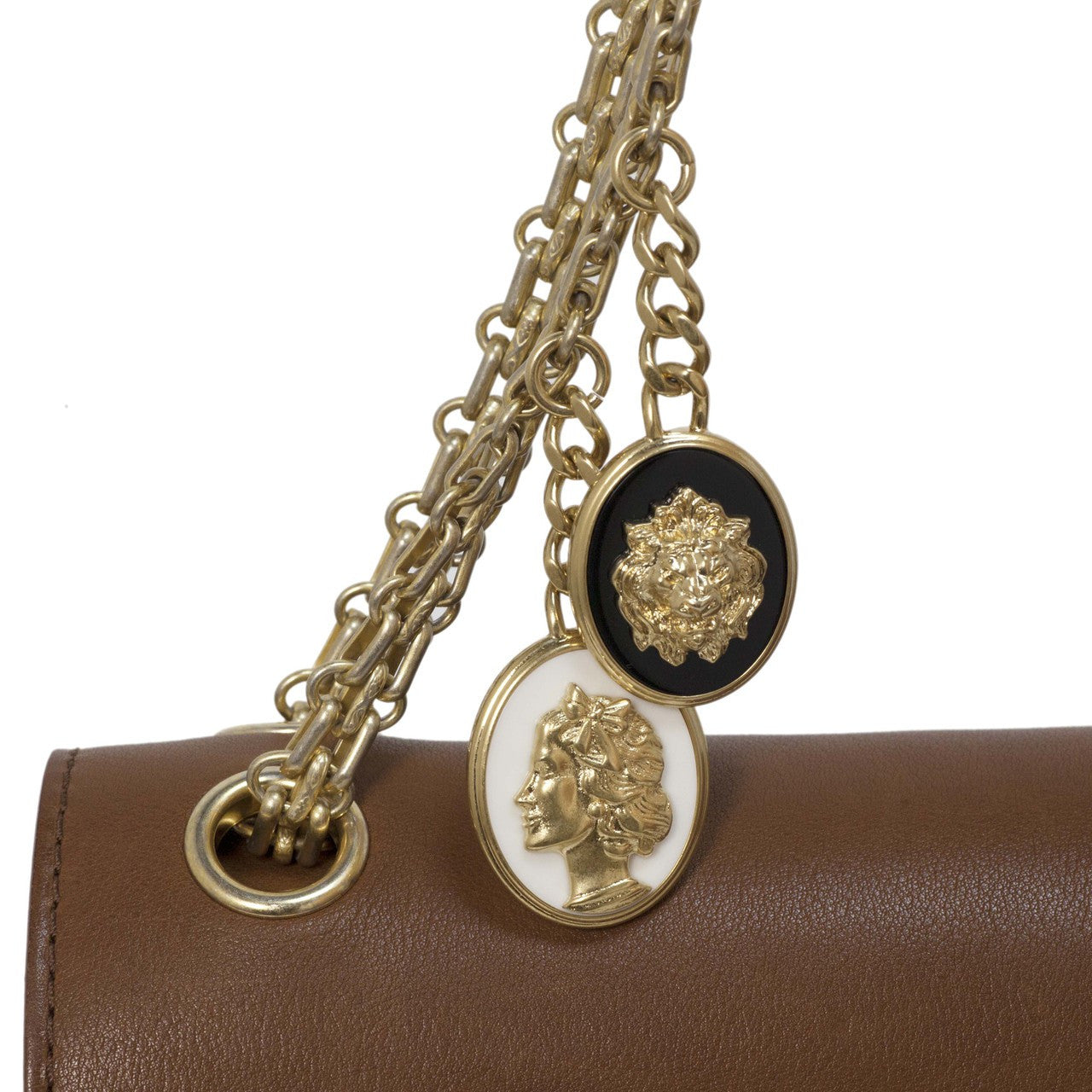 Authentic Chanel Brown Smooth Leather 2.55 Nude Bag. Made of smooth brown calfskin leather with gold tone hardware. It features a chain shoulder strap with medallion details, rear flat pocket, double flap design with twist lock closure and chain detail around the sides and base of the bag. The interior is lined with burgundy suede and has two flat pockets.