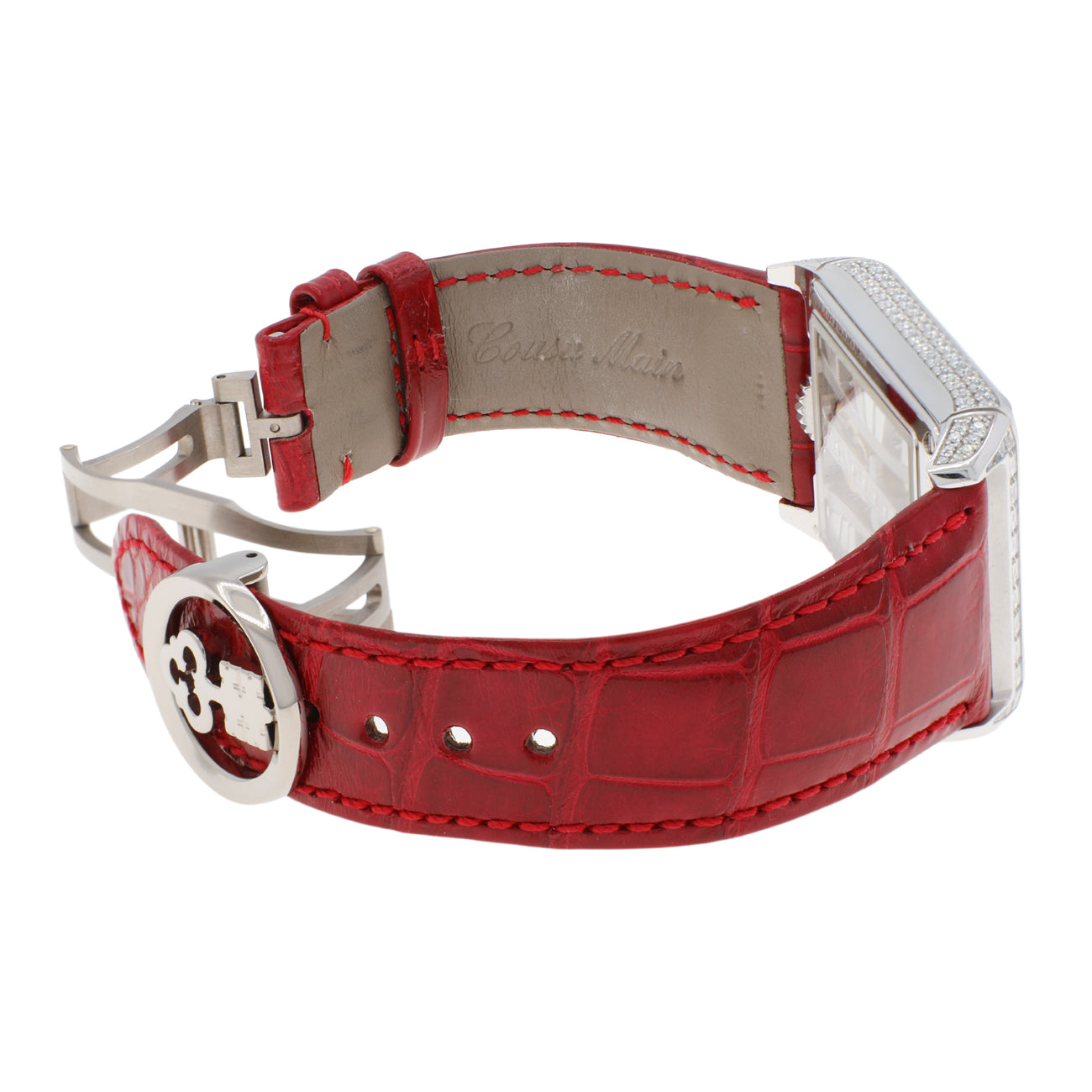 • Bracelet: Red leather strap with 18K white gold folding clasp