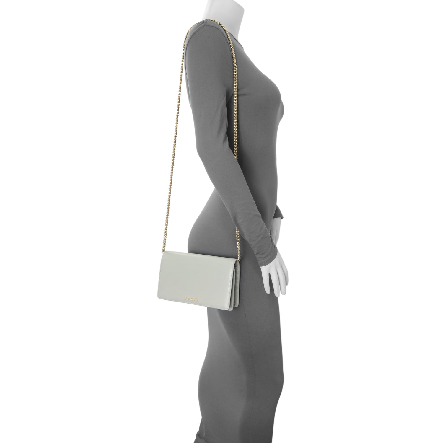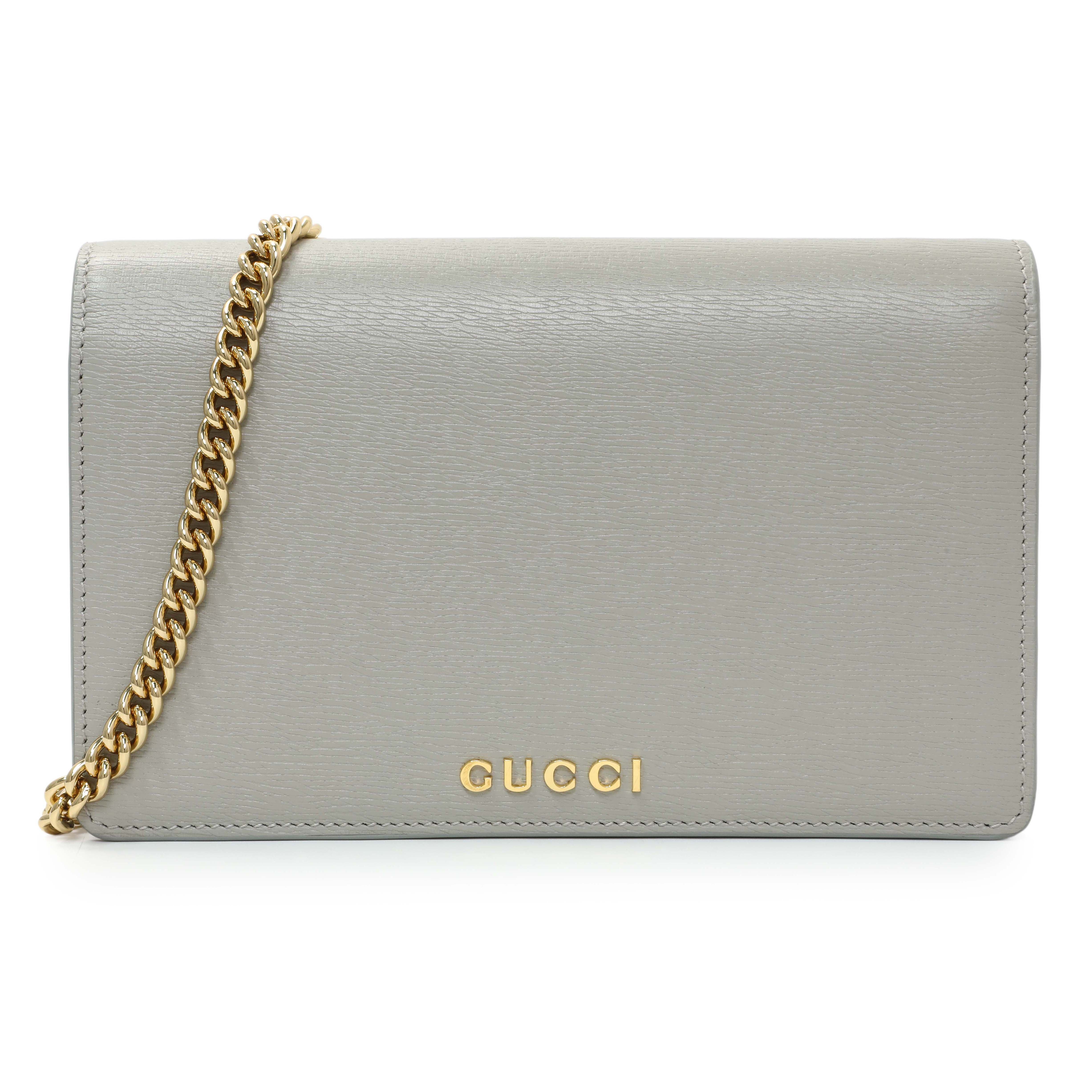 Gucci Grey Textured Calfskin Script Logo Chain Wallet