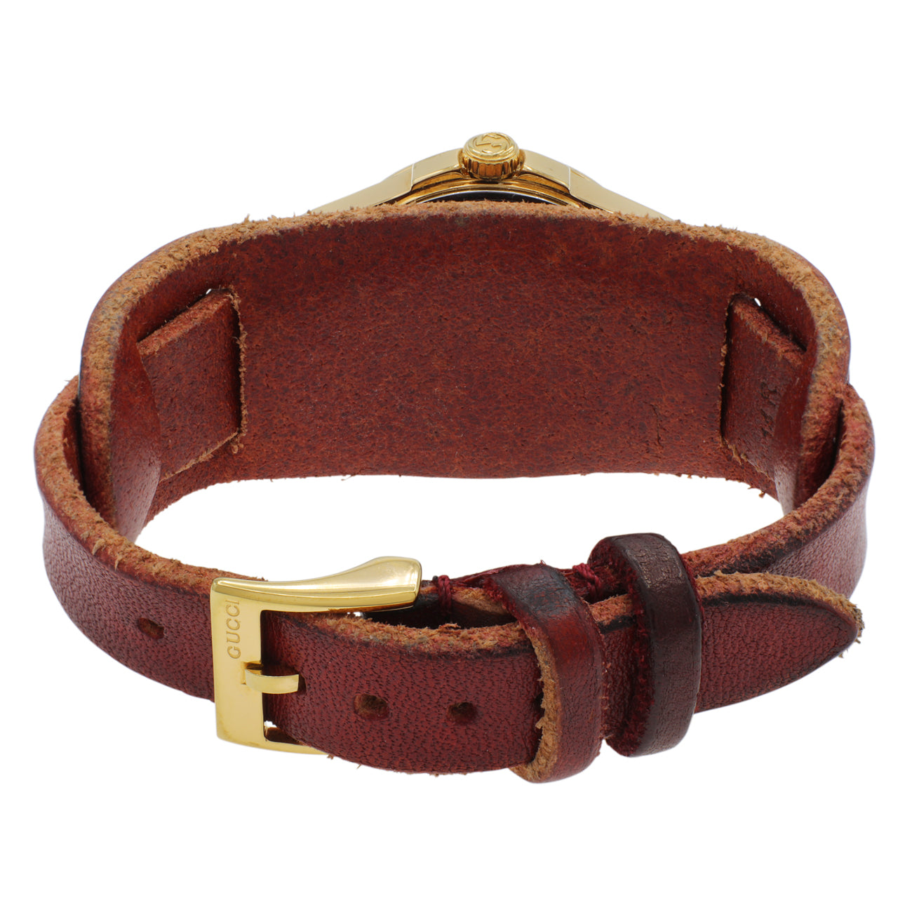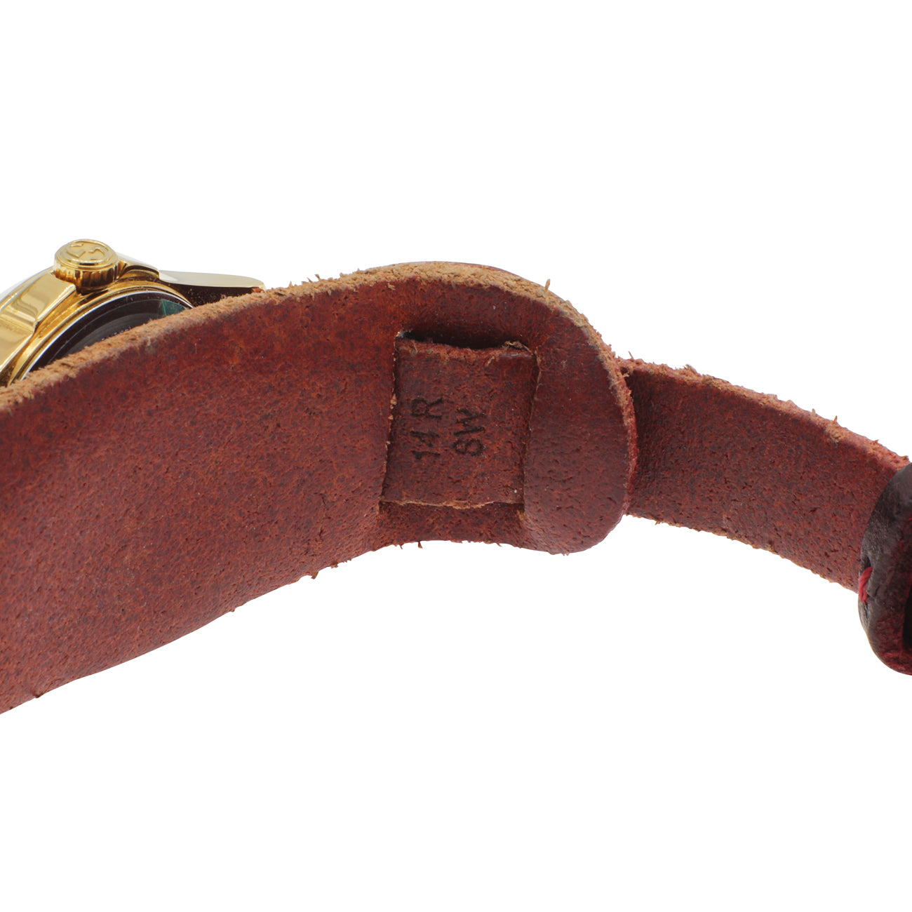 Light tarnish on gold tone surfaces, faint imprints on leather strap