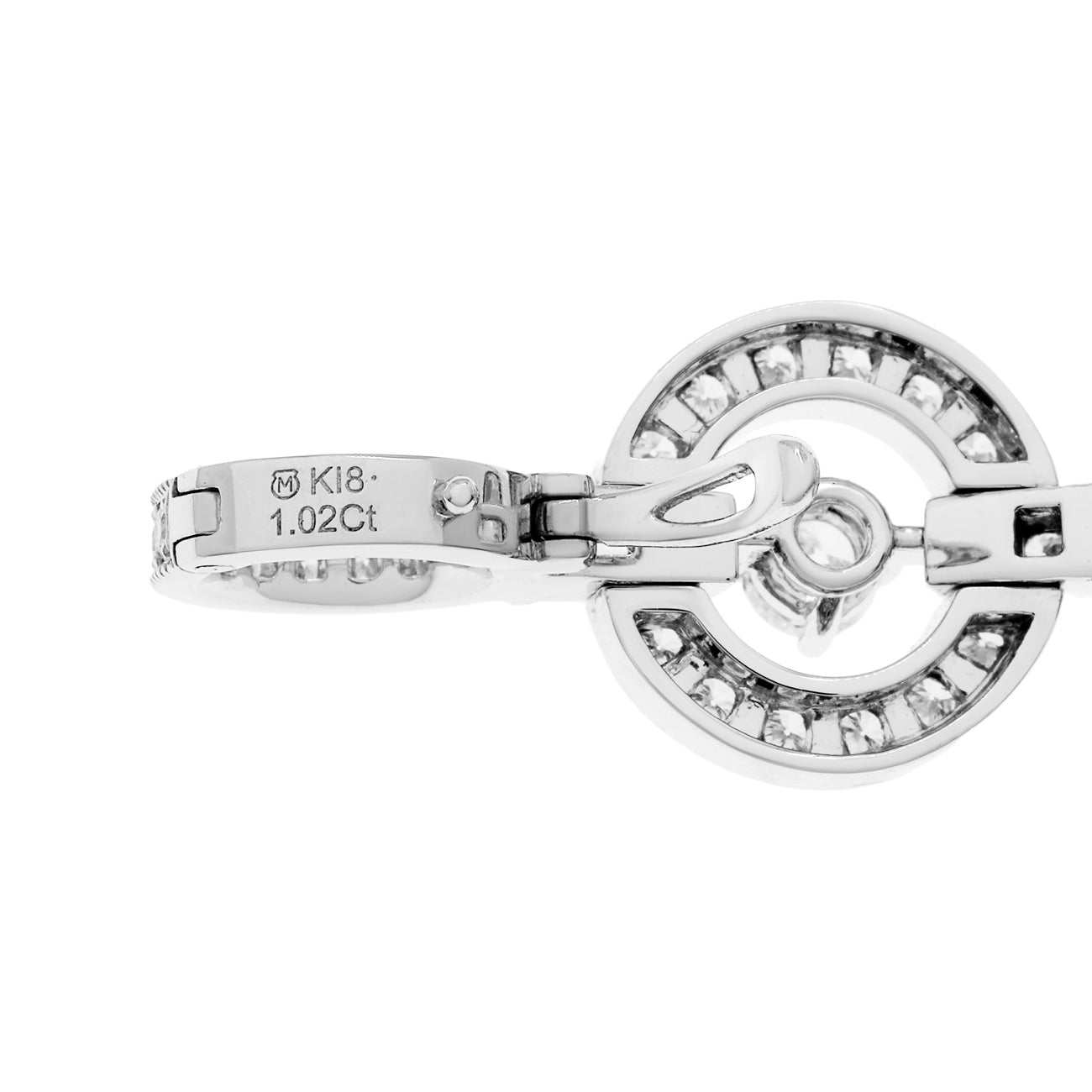 Set within the larger lower frame is a South Sea pearl, surrounded by natural full-cut diamonds bead-set into the frame. At the center of the upper frame, a claw setting secures a round brilliant cut diamond, also surrounded by natural full-cut diamonds, with additional full-cut diamonds bead-set along the front of the chain loop. Channel settings joining the frames and chain loop secure baguette cut diamonds.